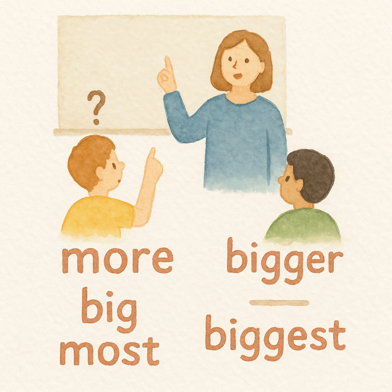 ์ค์ ํ ํ์์ด ์์ ๋ฒ์ฉ ๋ค์์ด์. “์ ์๋, more big์ด์ bigger์?” ์์ ์๋ ์น๊ตฌ๊ฐ “๋น์ฐํ bigger์ง!”๋ผ๊ณ ํ๋๋ฐ, ์ง๋ฌธํ ํ์...